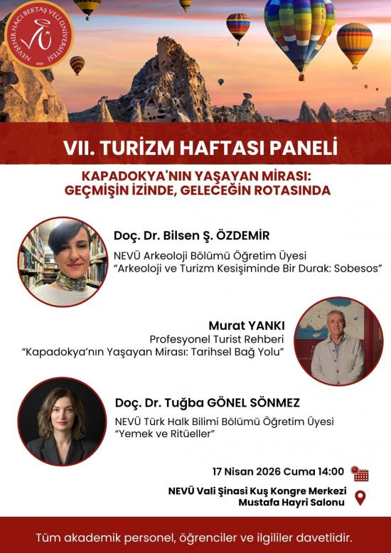 15–22 Nisan Turizm Haftası kapsamında NEVÜ Turizm Fakültesi bünyesinde düzenlenecek olan “VII. Turizm Haftası Paneli”, “Kapadokya’nın Yaşayan Mirası: Geçmişin İzinde, Geleceğin Rotasında” temasıyla gerçekleştirilecektir.